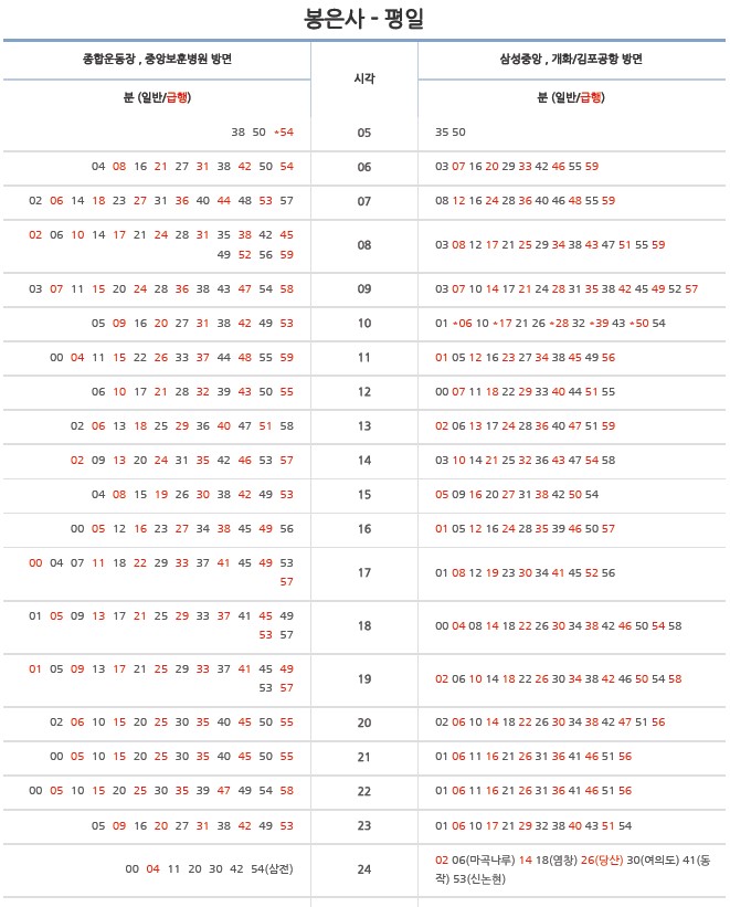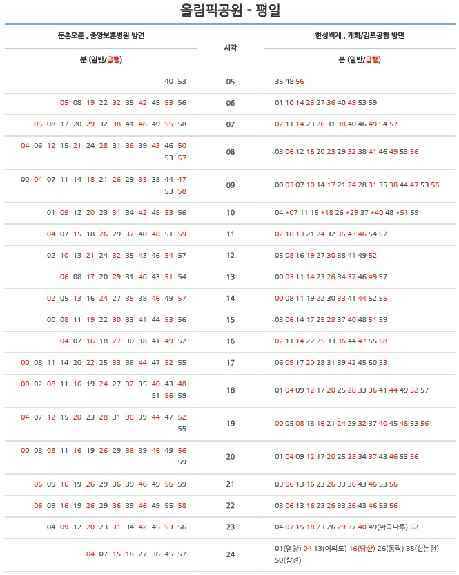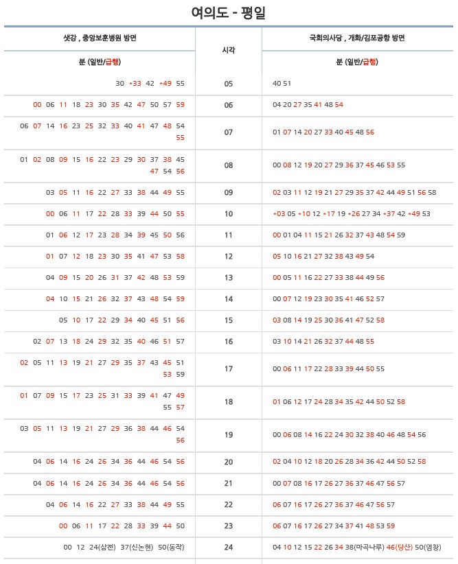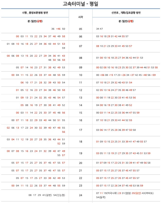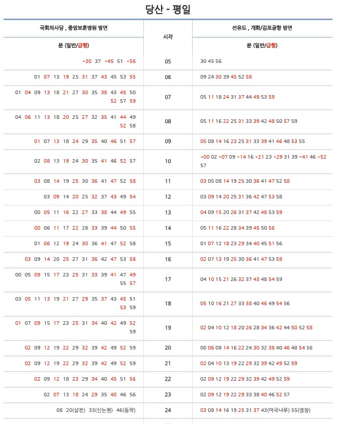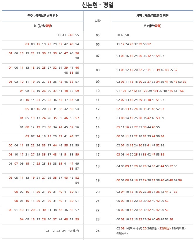특정 구간은 급행이라고 하여 대개 역에 정차하는 게 아닌 특정 몇 개 역만 지나고 날쌔게 이동할 수 있는 게 있고요 그중에서 많은 분들이 활용하고 있는 수도권 지하철 9호선 급행 노선 시간표와 정차역을 한번 볼게요.