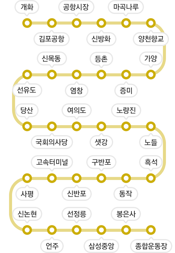 김포공항 - 마곡나루 - 가양 - 염창 - 당산 - 여의도 - 노량진 - 동작 - 고속터미널 - 신논현 - 선정릉 - 봉은사 - 결합운동장 - 석촌 - 올림픽공원 - 중앙보훈병원