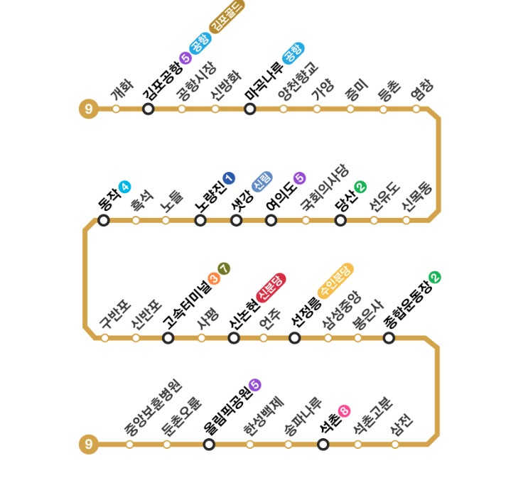 9호선은 개화역에서 중앙보훈 병원역까지 연결되어 있는 노선이고요. 일반열차는 총 38개 역에서 정차하고 급행열차는 김포공항부터 중앙보훈 병원역까지 16개 역에서 정차해요.