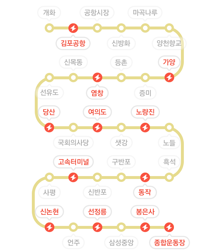 그 중 급행 정차역은 총 16개 역으로 김포공항, 여의도, 노량진, 고속터미널, 신논현, 결합운동장 등 통행량이 많은 주요역에서 정차하고 있습니다.
